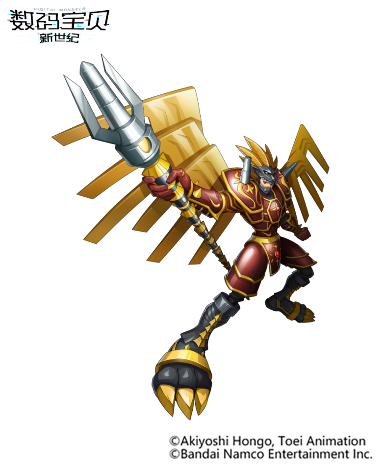 继承了十斗士的全部力量的数码宝贝,由于获得了未知能力而具有超越传说的暗之能力。没有人目睹过这位勇士,甚至连与其对峙的敌人都没有留下过证言,被称作“黑暗守护帝”。奥义技是让周围一带一切物理法则都失效并消灭敌人的“黑定理”,通常技是从头部狮子眼睛放出的“红十字架”。