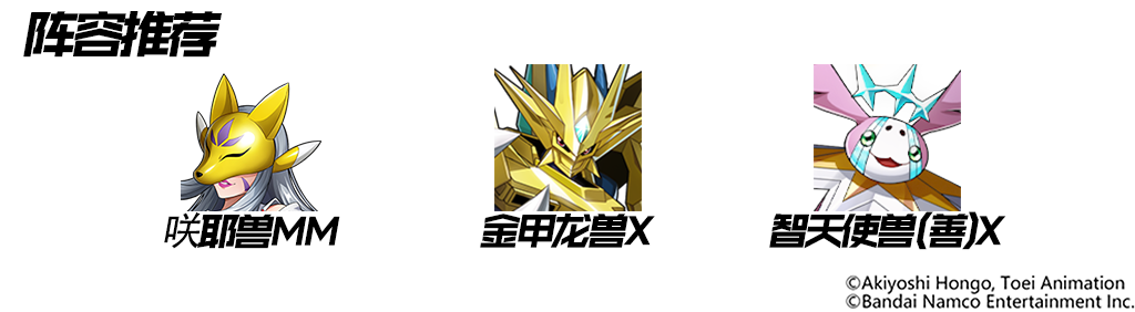 这里歌子和策划大大推荐您在组建挑战阵容时,选择有禁止复活效果的数码宝贝,同时选择高输出数码宝贝,实现针对青龙兽和咲耶兽MM。以下为推荐数码宝贝: