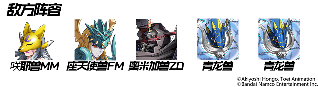 敌方阵容包括两只具有高输出能力的青龙兽,可以复活队友的咲耶兽MM,一只拥有特殊机制的奥米加兽ZD以及较高血量值的座天使兽FM。