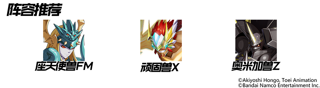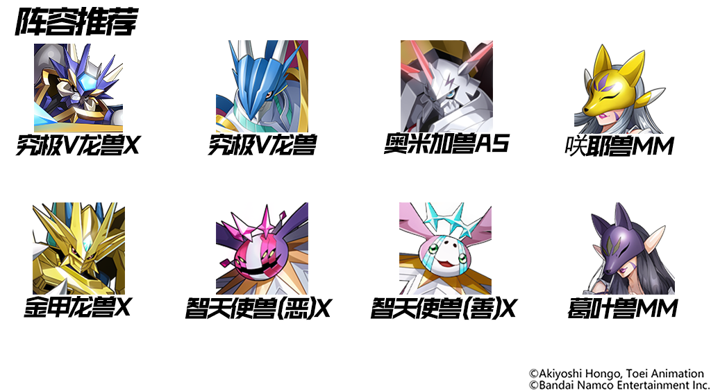 这里歌子和策划大大推荐您在组建挑战阵容时,选择必定先手的数码宝贝,同时也要考虑到敌方阵容的高输出角色,进而选择保护型数码宝贝。这样才能避免被敌方连环收割!以下为推荐数码宝贝: