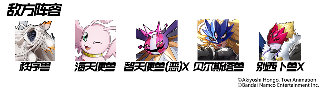 敌方阵容包括依靠机制可以造成生命百分比伤害的秩序兽,一只可以免疫减速效果且血量耐打的海天使兽,一只会净化速度降低效果的智天使兽(恶)X以及具有高输出能力的贝尔斯塔兽和别西卜兽X。