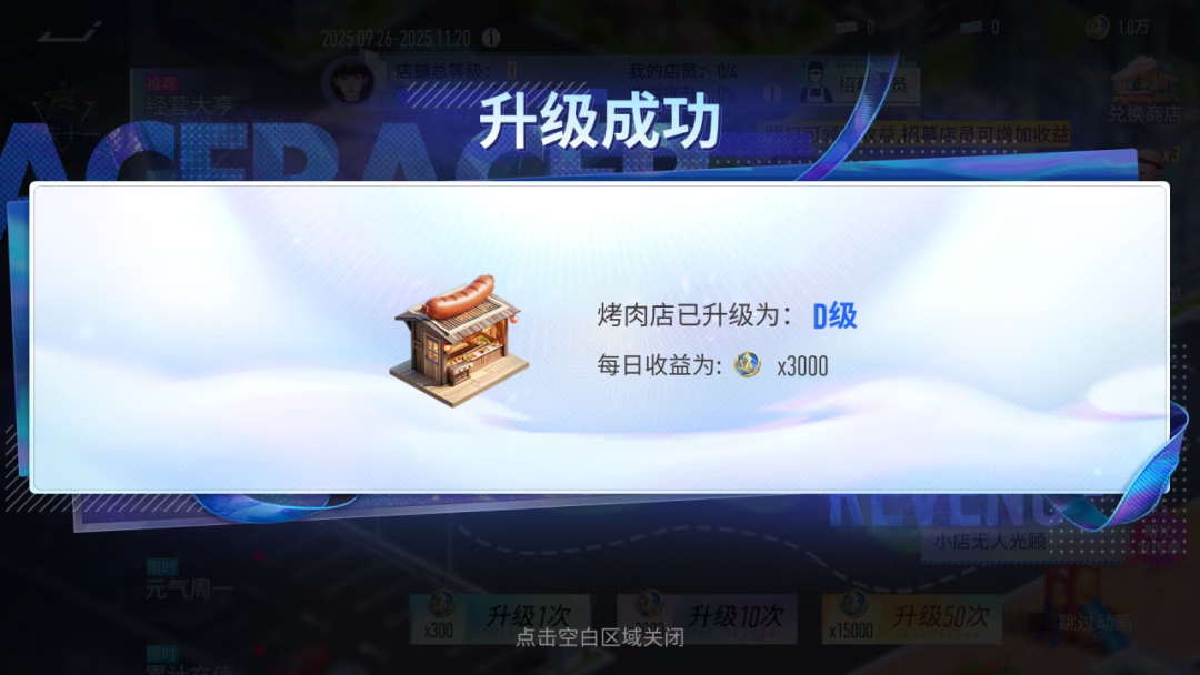 玩家可在每家店铺的图标旁查看当前店铺等级以及升级所需的材料。使用经营币升级即可随机获得各店铺的星级卡、打工卡、帮忙卡以及经营币。各店铺星级卡将提供对应数量的升级材料。