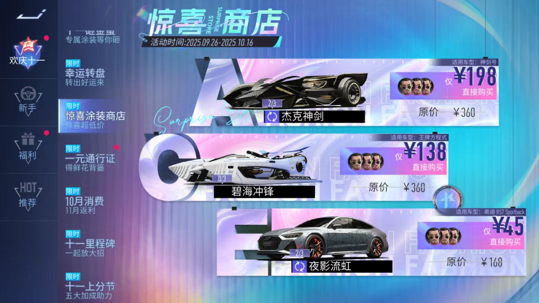 此外,惊喜涂装商店也会在活动期间上线,玩家可随机抽取折扣涂装商品,不喜欢的涂装还可以刷新重随,每次购买商品还可以额外获得刷新次数。