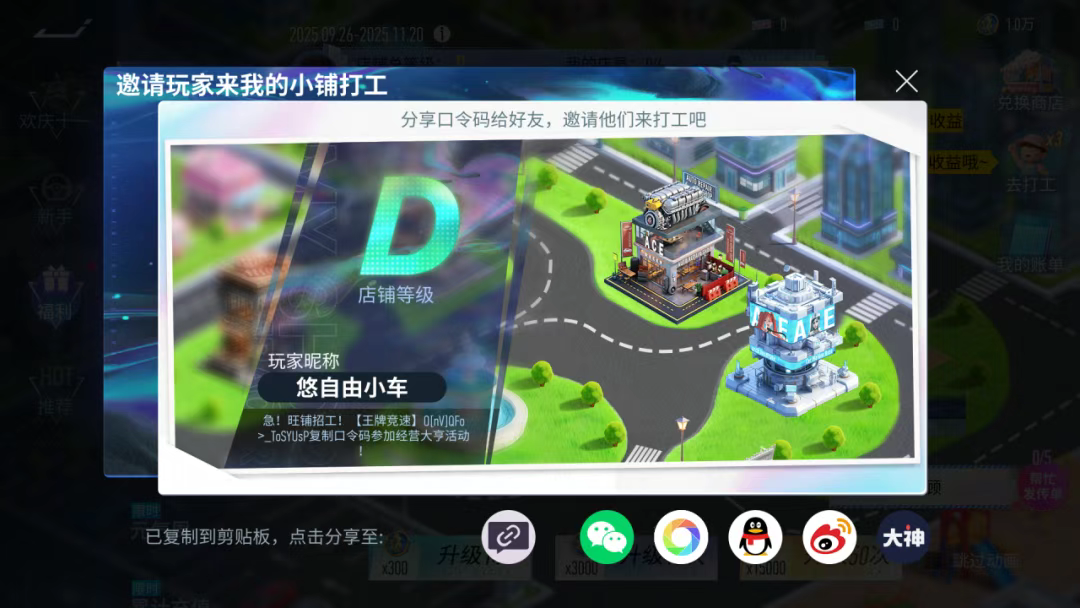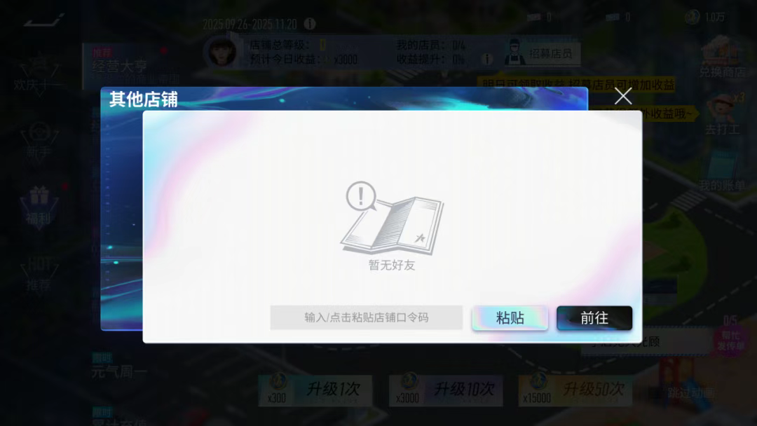 除店铺升级外,玩家还可通过招募店员、打工、帮忙或完成突发事件获得额外增益。通过分享店铺口令码即可邀请其他玩家每有一个玩家来店铺打工,店铺当日收益+20%。