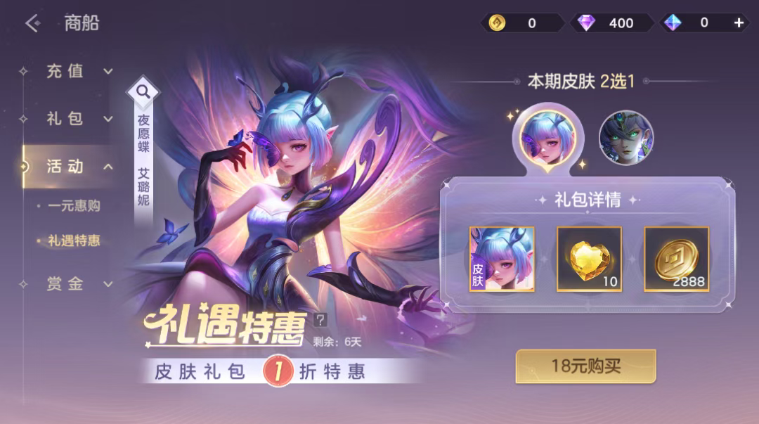 在10月10日-10月17日,还有“礼遇特惠”礼包限时开启1折,仅需18元玩家就可在艾璐妮·夜愿蝶、美杜莎·都市乱神两款皮肤中进行超值2选1获得。