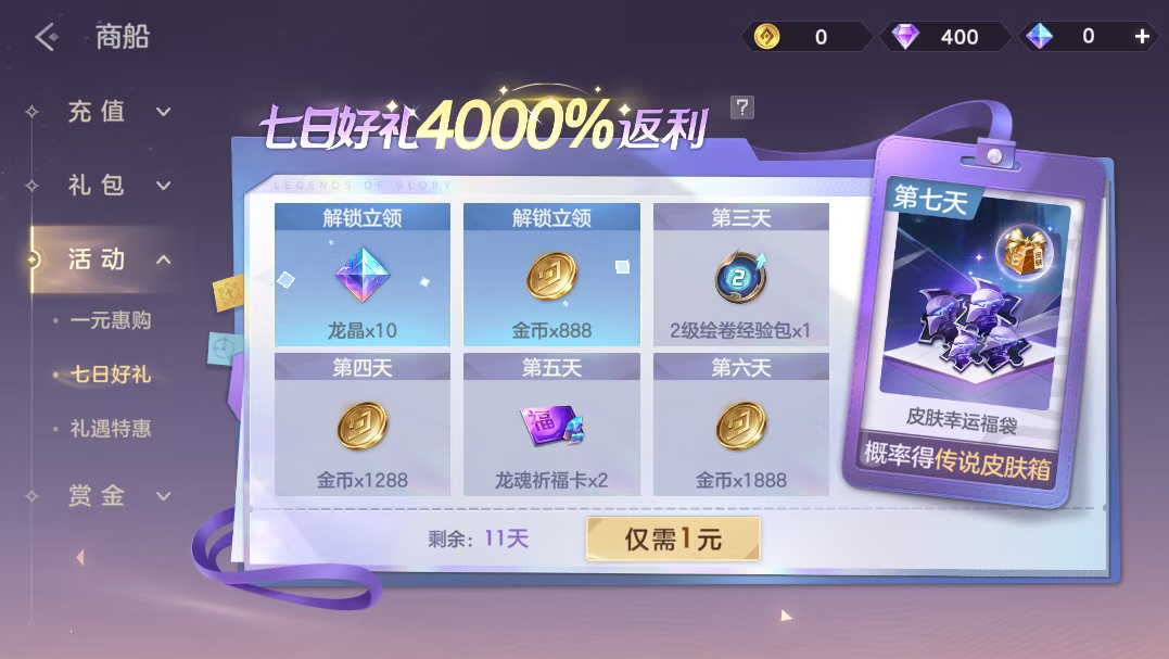 在10月13日-10月27日,还有“七日好礼”活动上线,玩家付费1元解锁登录活动,登录游戏即可获得龙晶10、龙魂祈福卡、2级绘卷经验包等奖励。累计登录7天后必得皮肤碎片10,有概率额外获得传说皮肤自选箱。