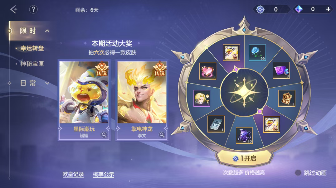 在10月15日-10月22日,“幸运转盘”限时开启,玩家使用龙晶购买或完成任务获取幸运币,进行抽奖。李文·掣电神龙、鳗鳗·星际潮玩、幸运星英雄自选箱、拿下表情、龙魂祈福卡、皮肤碎片、改名卡等奖励等你来抽!最多6抽获得1款皮肤,最多9抽可获得全部奖励,前2抽抽到皮肤的守护者会获得欧皇称号。