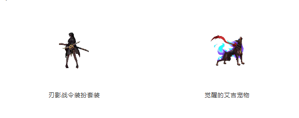 黄金刃影战令:包含刃影战令装扮套装礼盒(账号绑定)、觉醒的艾吉宠物礼盒(账号绑定)、宠物饼干礼盒、矛盾的结晶体(账号绑定)、幸运符(账号绑定)、次元灵驿装备(武器)等奖励。