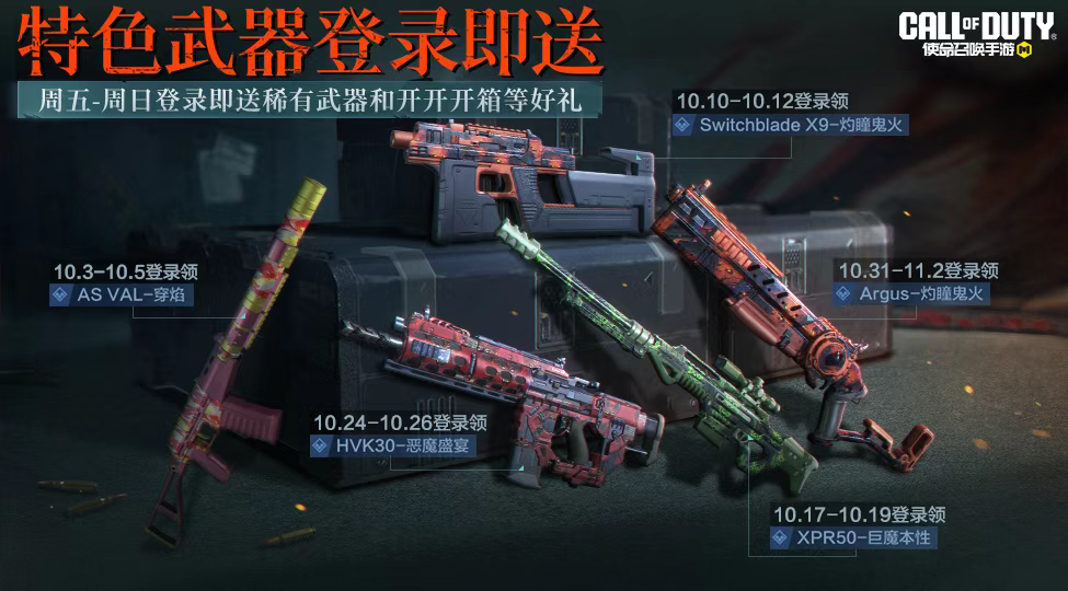 在10月24日,“周末登录礼”活动上线,玩家周末登录游戏,就能轻松获得稀有级武器HVK30-恶魔盛宴、开开开箱和福利点券等奖励。