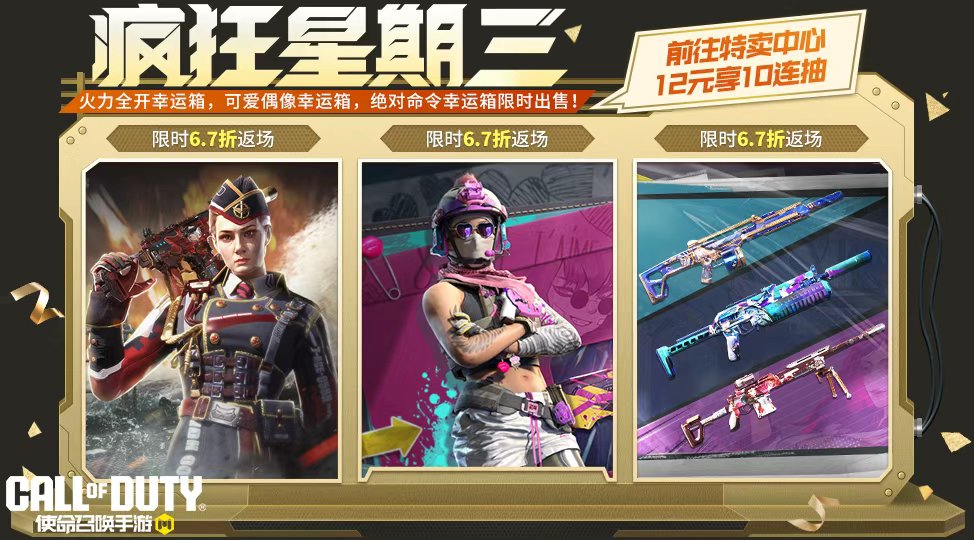 在10月22日,本周的“疯狂星期三”活动中,游戏还会返场三款高人气宝箱,它们分别是:火力全开幸运箱、可爱偶像幸运箱、绝对命令幸运箱。疯狂星期三活动期间,玩家将享受6.7折的超值福利优惠。本次返场的三个宝箱各拥有一次特惠十连抽体验,玩家前往“特卖中心”,花费12软妹币即可十连抽一次!