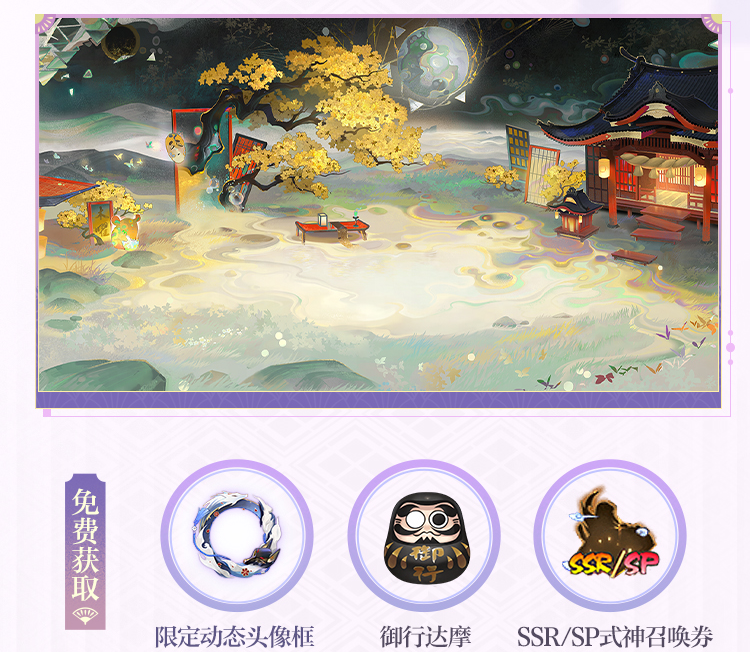 在该活动中,玩家还可获得限定动态头像框、御行达摩、SSR/SP式神召唤券作为奖励。