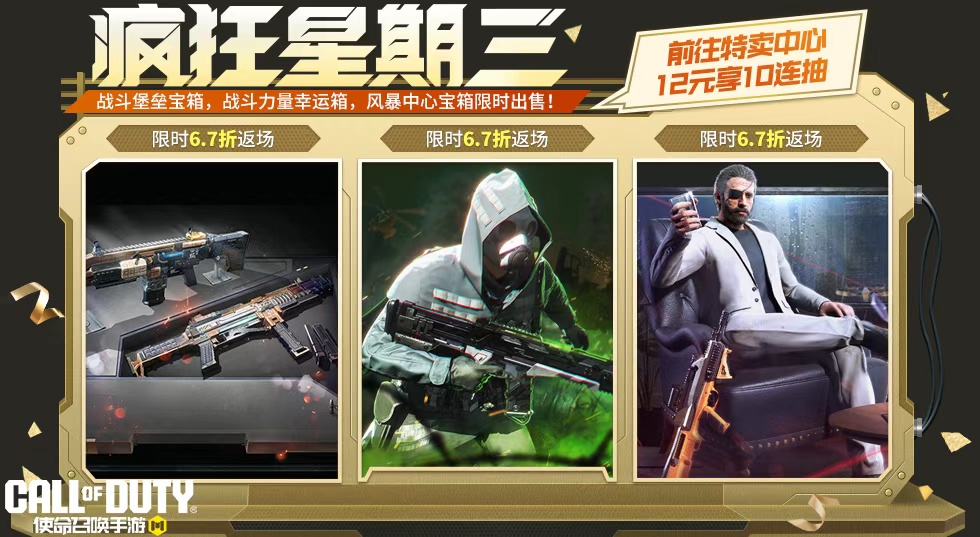在12月17日的疯狂星期三活动中,使命召唤手游还将返场三款高人气宝箱,分别是:战斗堡垒宝箱、战斗力量幸运箱和风暴中心宝箱。活动期间玩家将享受6.7折的超值福利优惠。本次返场的三个宝箱各拥有一次特惠十连抽体验,玩家前往“特卖中心”,花费12软妹币即可十连抽一次!