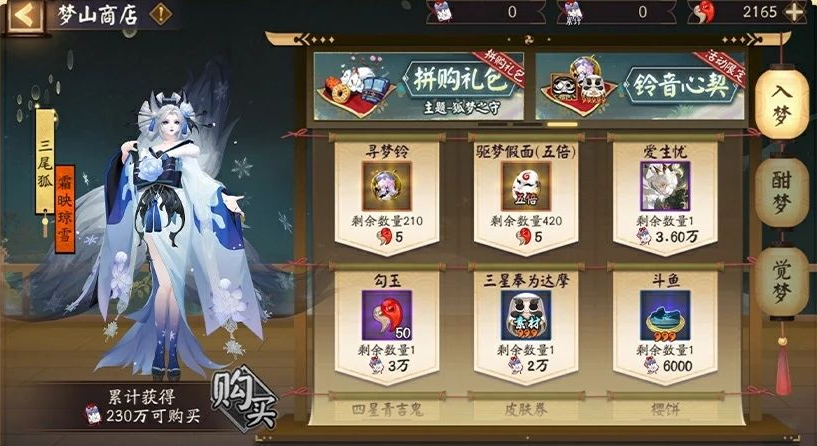 在“狐梦之守”的活动商店“梦山商店”中,玩家通过各玩法获得的道具“狐梦守”可用于兑换三尾狐全新免费新皮肤“霜映琼雪”、SSR/SP式神召唤券、御行达摩活动专属头像框和插画等多种奖励。