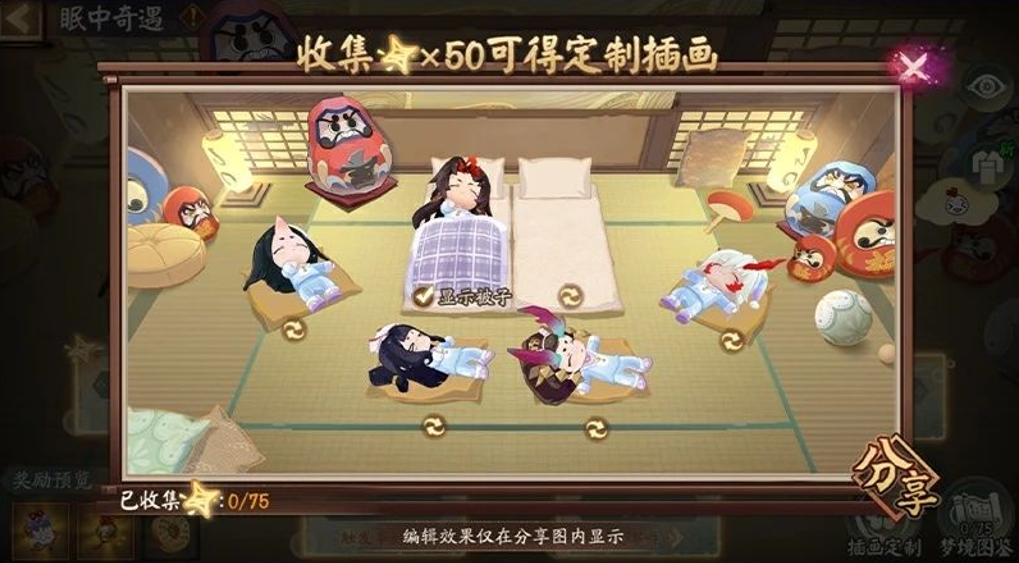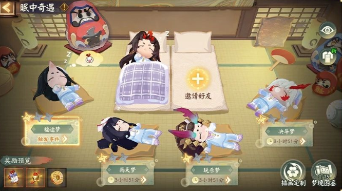在12月17日,“眠中奇遇”活动中酣然入睡的崽崽们在得到充分睡眠后,将会遭遇梦境事件,每个式神对应1-3星梦境,完成正确的选项可解锁碎片剧情的道具“安寐铃”,收集式神的梦境还将获得定制插画“眠思趣想”。
