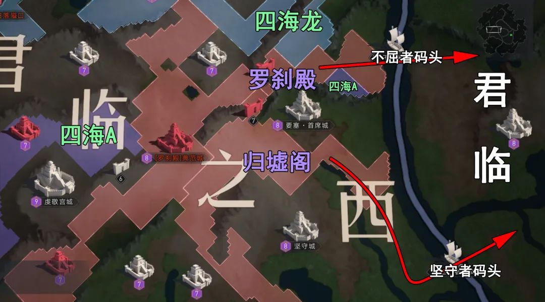 拿下关隘后,罗刹殿趁势继续推进,尽数蚕食了四海A在不屈者码头前的领地,暂时将码头进攻线收入麾下,归墟阁则是往南进发,把坚守者码头列为了君临进攻路线,至此君临之西的战事也暂告一段落。
