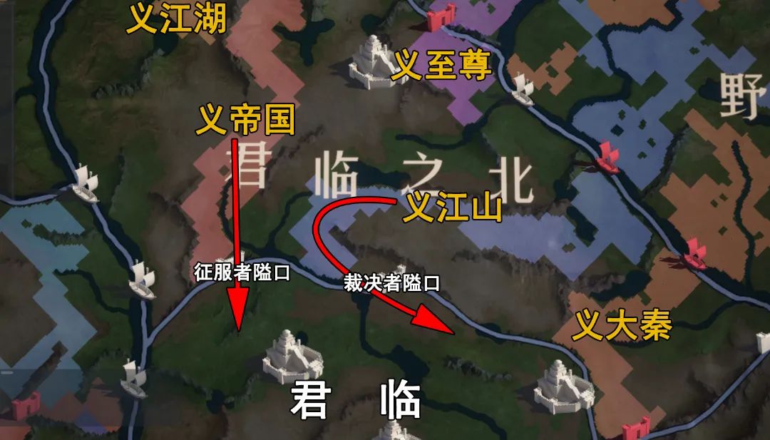 义统盟入主君临之北,直至目前依然没有出现竞争者,因此他们的推进可谓是轻松愉快,义帝国和义江山已经分别推进至征服者、裁决者两大隘口,只待君临开启之日,就是他们入关之时。
