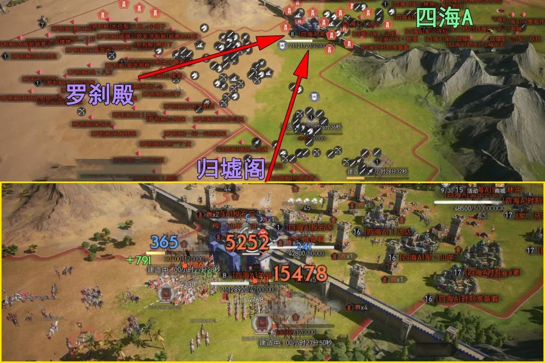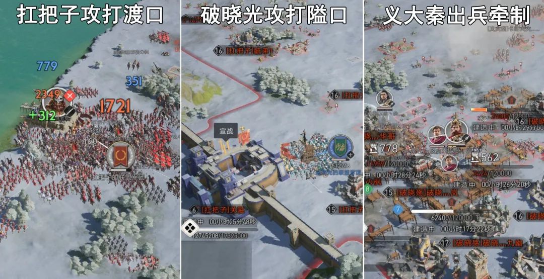发现这一点的扛把子立马召唤盟军,义大秦派遣精锐部队抵达前线,从侧面牵制破晓殇,扛把子则全力进攻渡口,另一面的破晓光又对扛把子后方的6级关隘发动了进攻,在同一个时间点,军道宫城附近出现了3个战场。