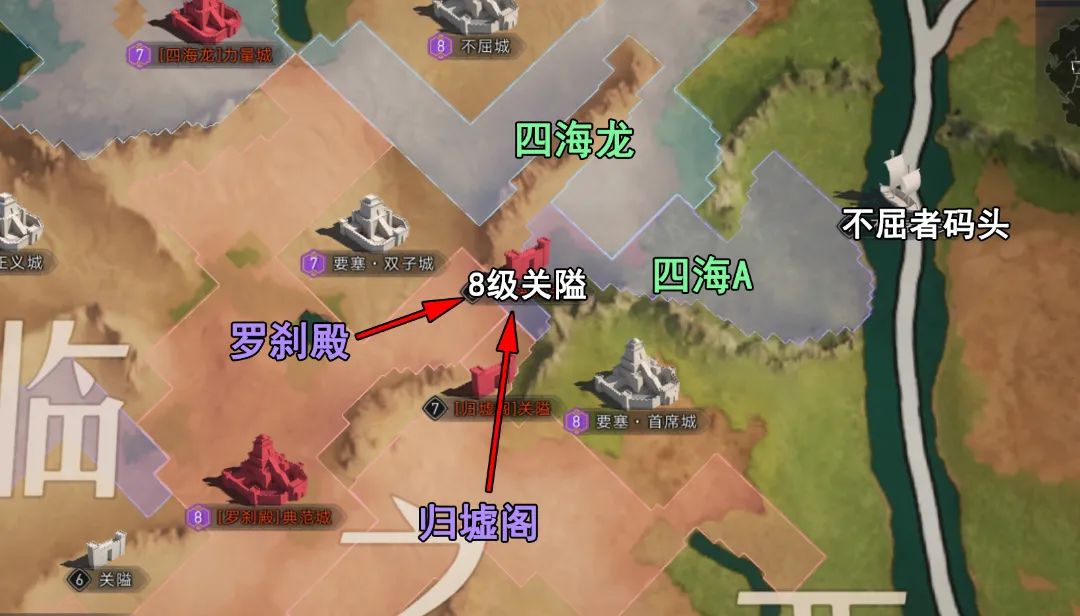 由于四海龙无法通过四海A的8级关隘,只能绕一圈远距离进行防守,而归墟阁和罗刹殿则能同时直击关隘,光凭四海A单联盟的防守实力,显然不足以阻挡罗刹归墟联盟的进攻,最终只能弃关退守。