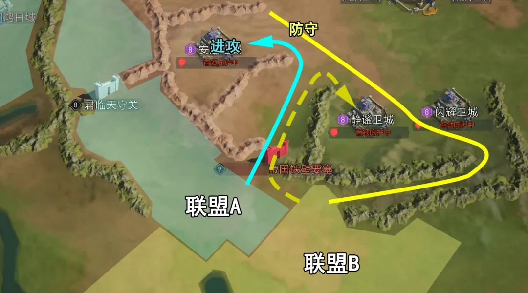 如果双方大优,实力上对竞敌有明显的压制,可以选择间隔一个关口进攻,比如铁壁要塞和遣兵港,进去后先朝中间的坚壁要塞合攻,拿下后驻扎一部分兵力在坚壁要塞附近,大部队再回头朝两边出击,这样可以占领更大的区域