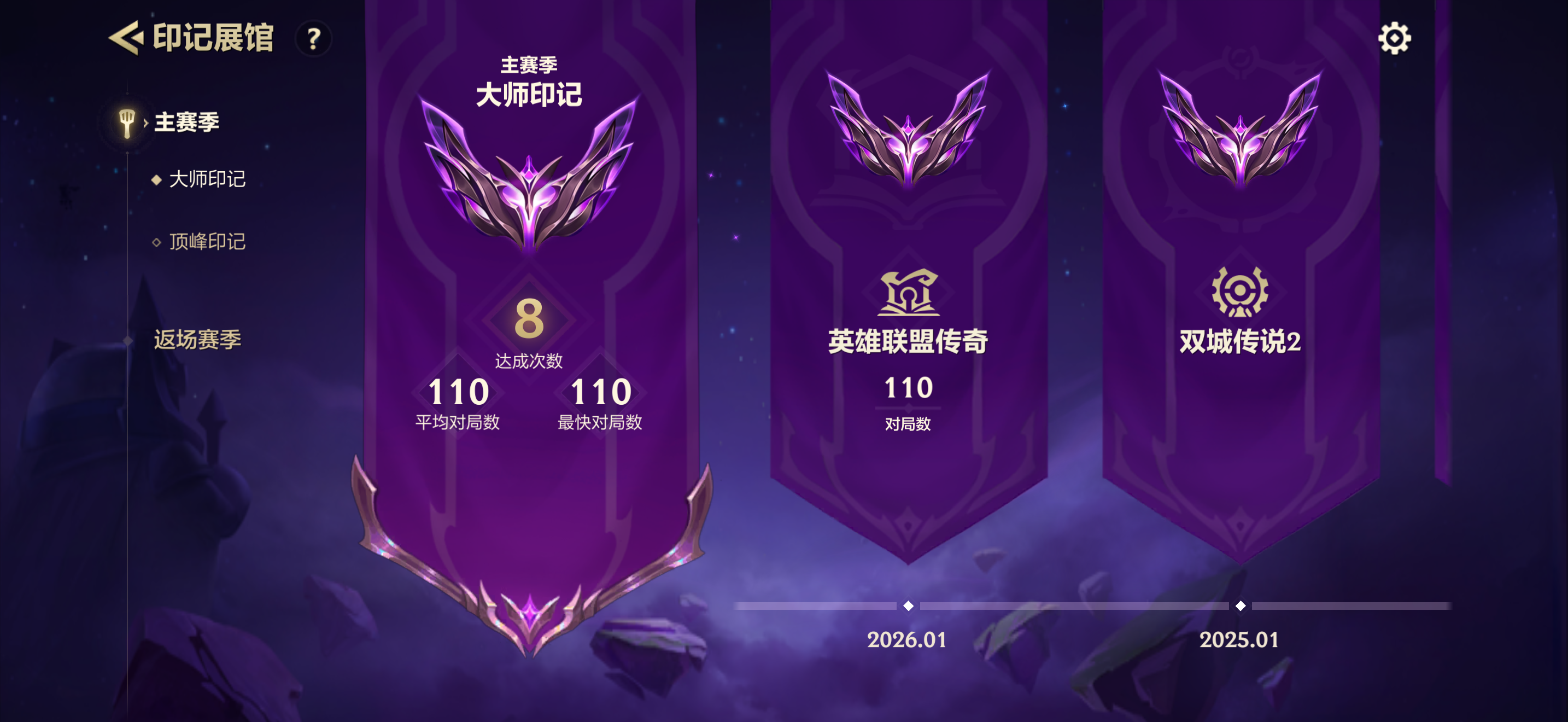 大师印记将展示同赛季标准排位和团队排位中更快达到大师的模式的对局数;