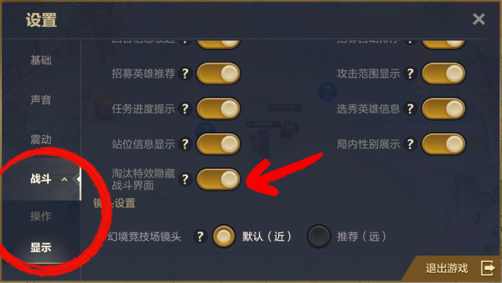 当然可以!福星版本更新后,我们为弈士们提供了自由开启/关闭【淘汰特效隐藏战斗界面】的选项。