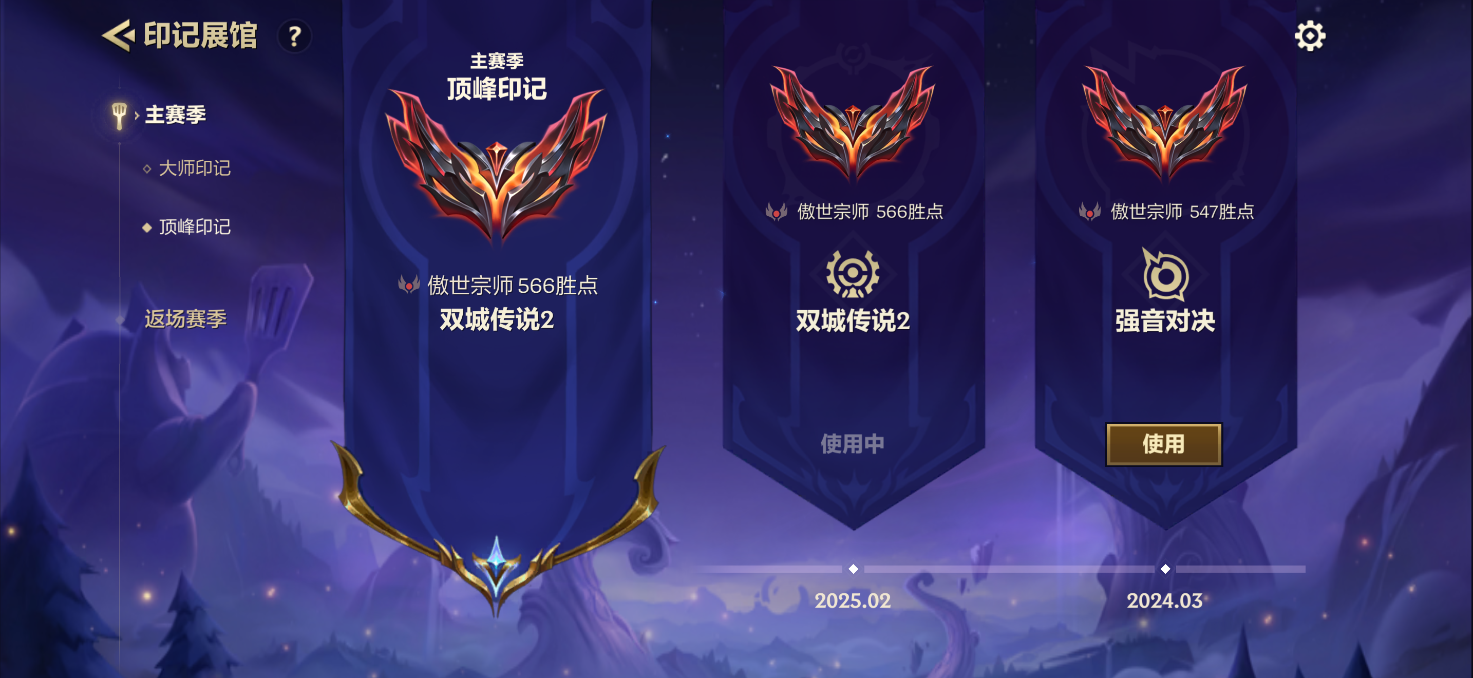 顶峰印记将展示同赛季标准排位和团队排位中达到段位更高的模式,若段位相同则展示排名更高的,若排名相同或没有排名则展示胜点更高的;