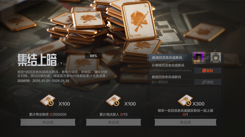 1月1日-1月15日,集结上暗活动开启!绑定暗区老兵或新兵,参与对局即可领取500赛季装扮券