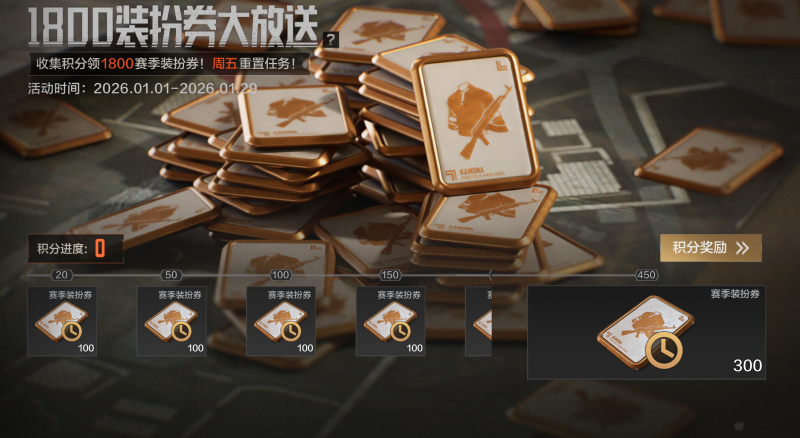 1月1日-1月29日,完成每周任务获得积分,至多可领取1800赛季装扮券