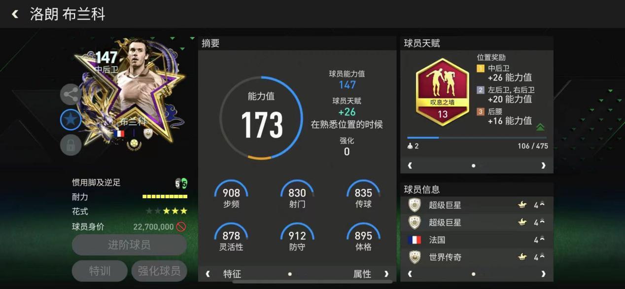 至尊传奇布兰科配备了叹息之墙天赋,将布兰科本就出色的单防能力进行了进一步的放大,满格耐力的配置也极大程度提升了他的场上效率,除此之外,他的传球数据与灵活性也有了显著提高。