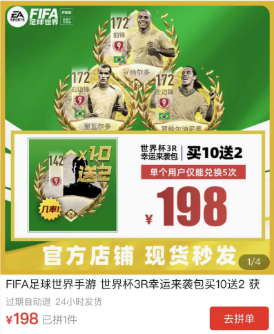 亲爱的玩家,《FIFA足球世界》全新世界杯3R幸运来袭包正式在京东及拼多多平台上架啦!玩家有几率从中获得9阶罗纳尔多、9阶里瓦尔多、9阶罗纳尔迪尼奥等重磅好礼,更有买10送2大优惠,心动的小伙伴们赶快来获取吧!