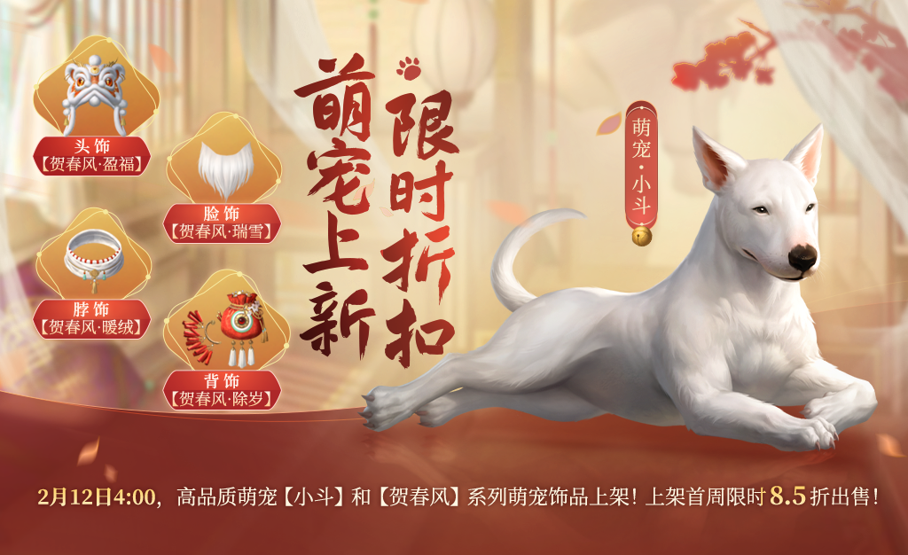 活动内容:高品质萌宠"小斗"和“贺春风”系列萌宠饰品上架萌宠商店,本次系列饰品包含脸饰"贺春风·瑞雪"、头饰"贺春风·盈福"、脖饰"贺春风·暖绒"、背饰"贺春风·除岁",上架首周限时8.5折出售,少侠不可错过!