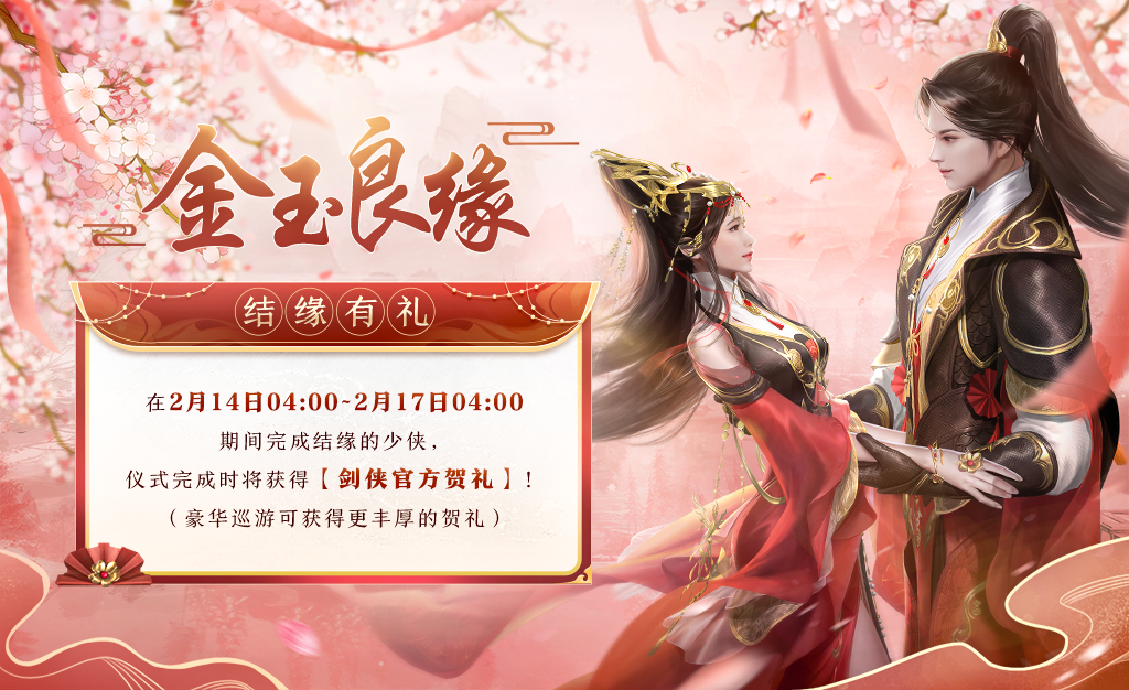 活动内容:喜迎情人节来临,少侠可与意中人共结情缘。同游江湖!活动期间筹办结缘仪式的少侠,仪式完成时将获得【剑侠官方贺礼】!筹办豪华巡游可获赠更丰厚的贺礼!