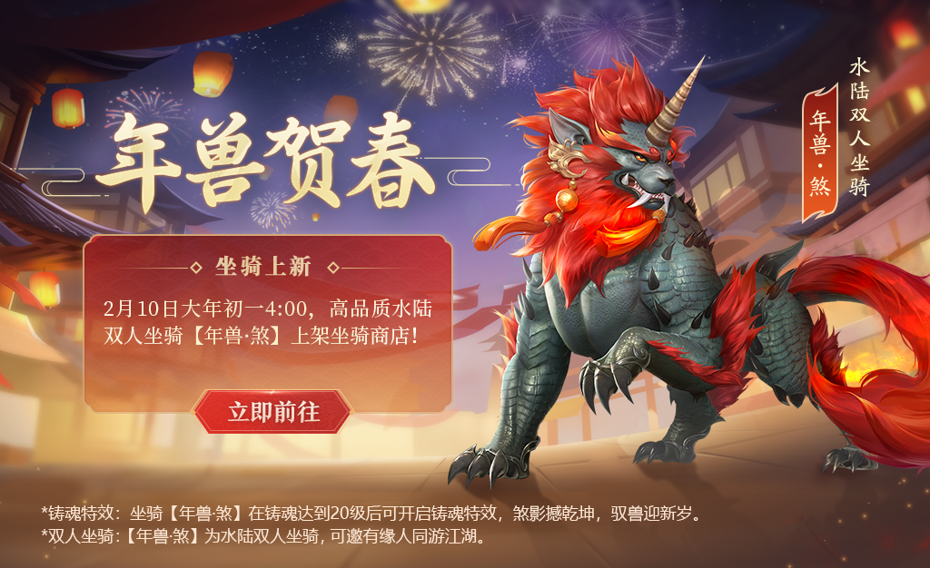 活动内容:威猛年兽坐骑【年兽·煞】上架坐骑商店,同贺新春!