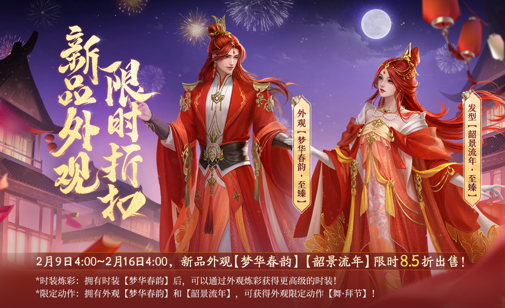 活动内容:上架新品【稀有发型·韶景流年】与【稀有外观·梦华春韵】,限时8.5折,活动结束后恢复原价。