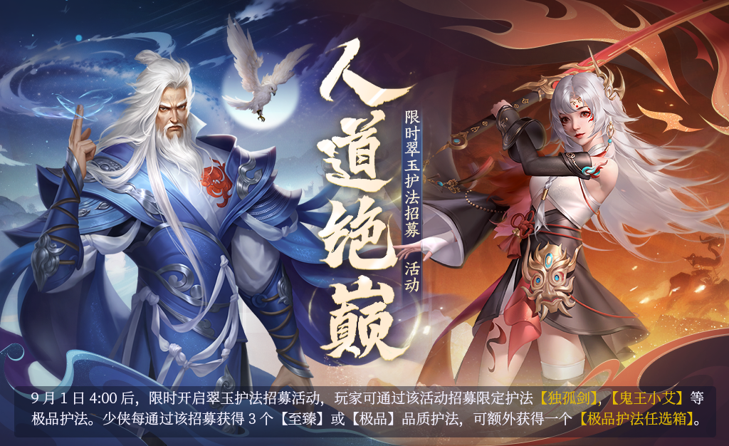 活动内容:限时开启翠玉护法招募活动!玩家可通过该活动招募限定护法【独孤剑】,【鬼王小艾】等极品护法!少侠每通过该招募获得3个【至臻】或【极品】品质护法,可额外加送一个【极品护法任选箱】。
