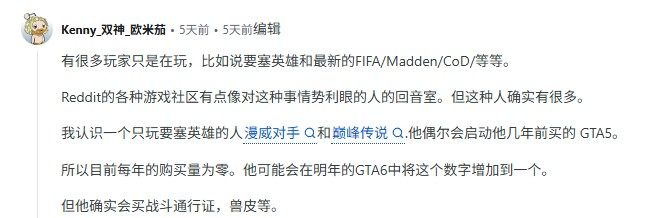 一个高赞评论则更加精辟:“确实有大量玩家只玩《堡垒之夜》以及当年最新的FIFA/麦登橄榄球/使命召唤等游戏。Reddit上各类游戏社区就像回声室,聚集了不少对此类现象嗤之以鼻的玩家。但现实中这类轻度玩家其实非常普遍。