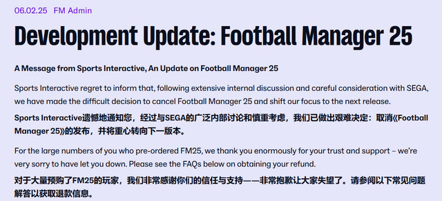 开发商SI虽然正计划在《FM25》中启用全新的Unity引擎,但却又因为开发过程中遇到的技术难题,于今年早些时候取消了《FM25》的开发。