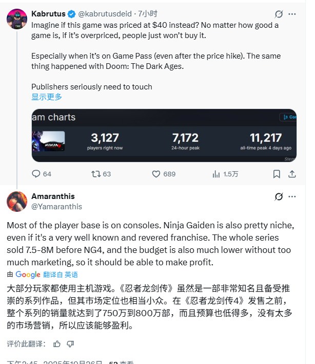 也有玩家建议《忍龙4》的定价或许应该是40美元,而非Steam上的70美元。因为不管游戏有多好,如果价格太贵,就不会有人买。尤其是在Game Pass涨价的情况下。《毁灭战士:黑暗时代》也是同样的情况。