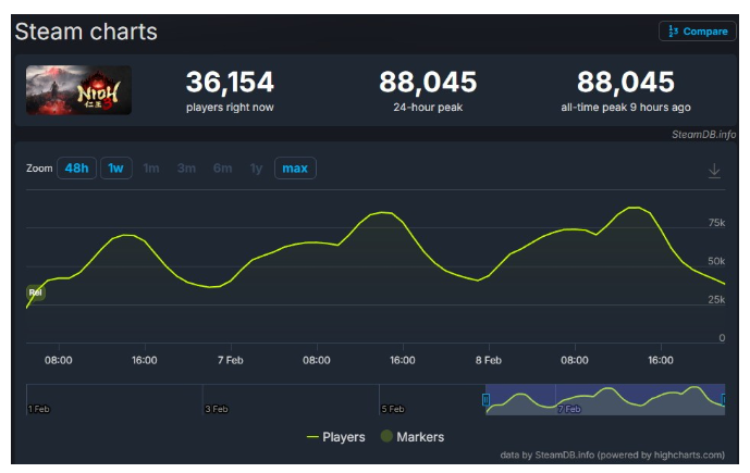 据SteamDB统计数据显示,《仁王3》Steam在线峰值为88045人,而《噬血代码2》Steam在线峰值仅为11499人,表现平平。《仁王3》也成为了光荣特库摩登陆PC平台热度最高作品。