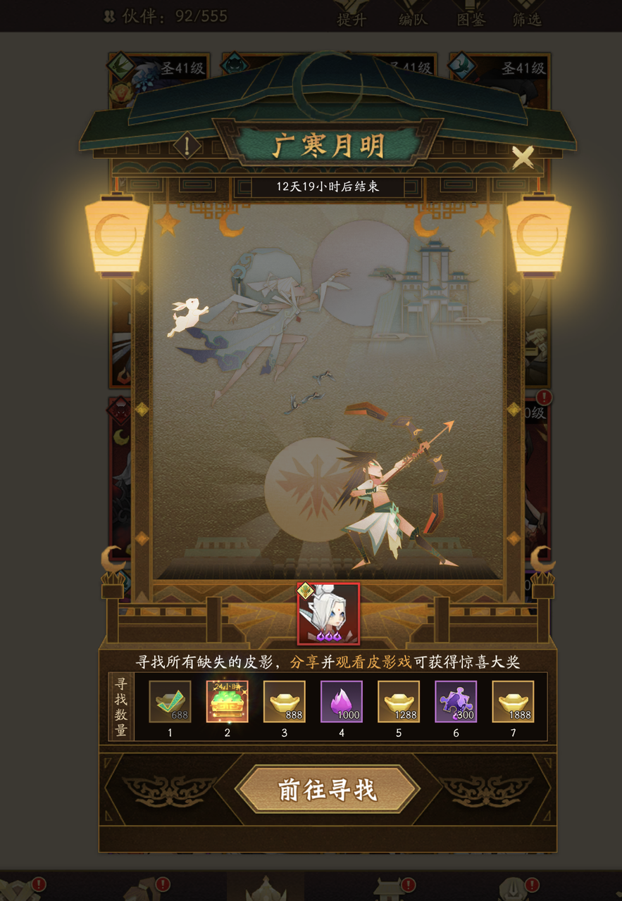 道友主线章节达到4章1回后解锁。 活动期间,每日解锁皮影线索,道友可根据线索找到皮影获得元宝、紫气和伙伴碎片等奖励,将所有皮影集齐后,还可获得终极大奖神族伙伴广寒仙子。