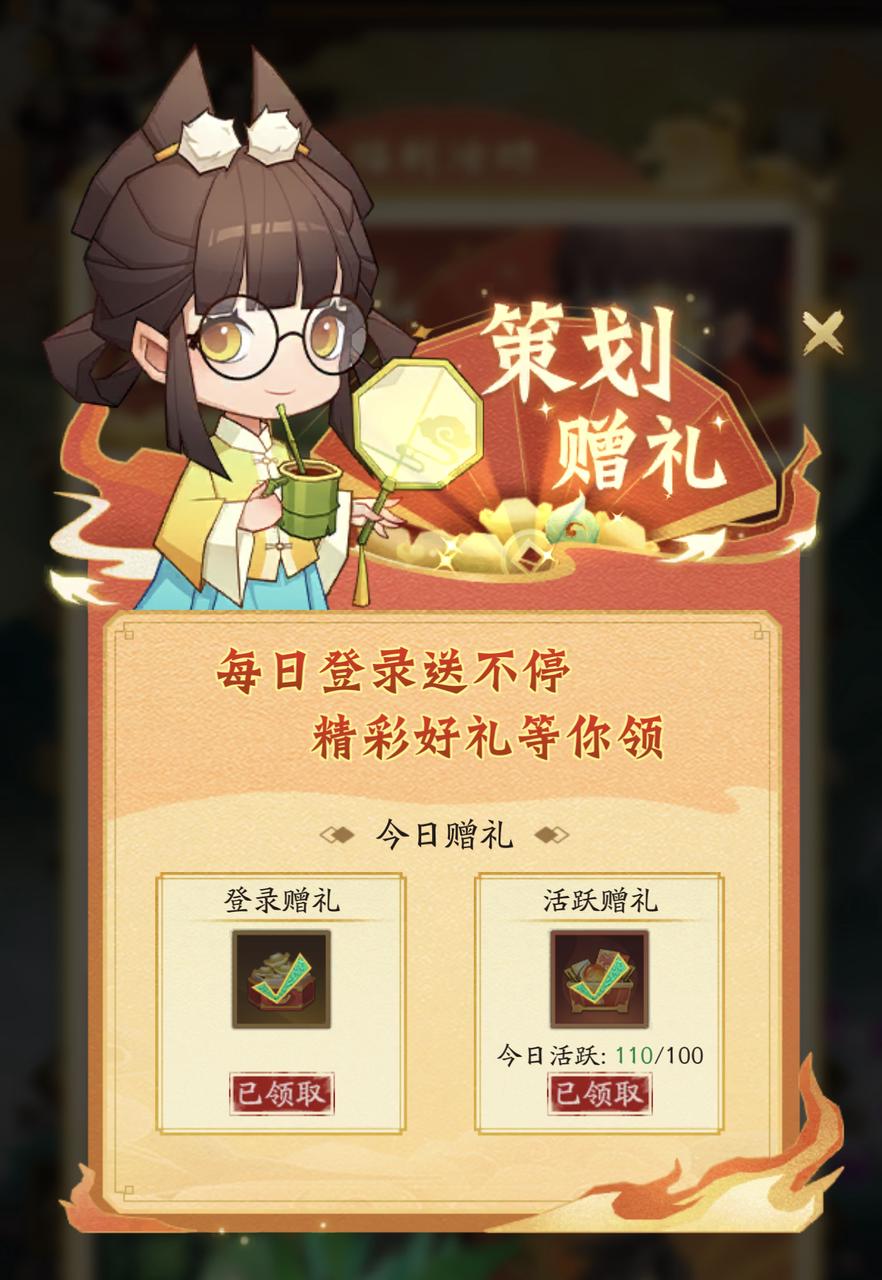 策划赠礼继续,登录送好礼在游戏【福利】——【策划赠礼】中,每日登录即可领取元宝礼盒,能开出最高1888元宝。当日活跃达到100后更可加码获得召唤道具礼包,可随机获得大量种族召唤券、高级召唤券、飞升灵珠、定向召唤券等奖励,助力道友在寻仙阁中唤出心意的伙伴。