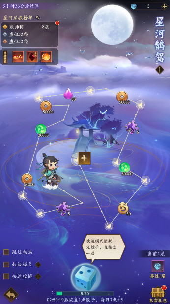 活动期间,投掷骰子即可探索星河宝藏并开启大奖宝箱,随着探索层数加深,宝箱中的自选奖励也会越来越豪华!探索达到对应层数更有幻彩石、红色五星装备、神魔自选、飞升灵珠等高级奖励。道友快快前来探索,一同揽遍星河珍宝吧!