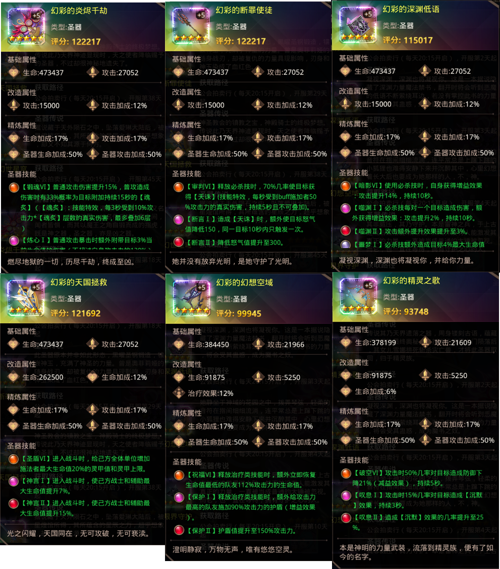 圣器方面两套一样,司弈带断罪使徒,卡牌带深渊低语,欧若拉带幻想空域,双子带精灵之歌,普罗/棉花带天国拯救。