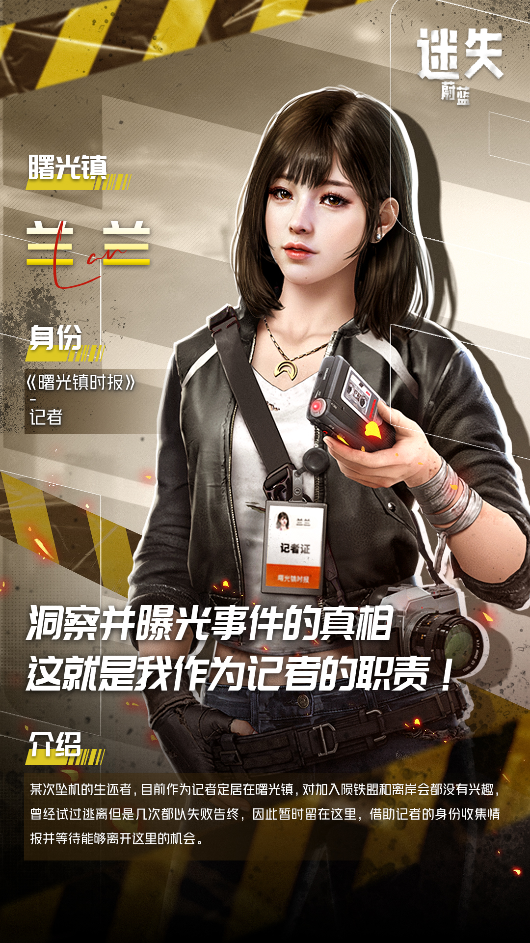 兰兰原本只是一名普通的大学生,却在某次乘坐飞机旅游时遭遇空难坠机海岛。她在经过各种艰难的生存困境后濒临崩溃,所幸被凯恩发现并带到曙光镇。恢复了自信和活力后,兰兰自告奋勇帮助凯恩救助其他幸存者,并成为了曙光镇最知名与活跃的记者。