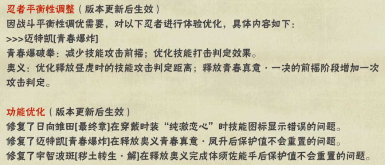在昨天的文章中我有提到过一个信息,那就是木叶快报没有说忍者调整,但说不定周更内容会有青春爆炸迈特凯的改动,果不其然,在正式公告推送的同时,青春爆炸迈特凯迎来了首轮优化和加强,只是这个加强的幅度并不大。