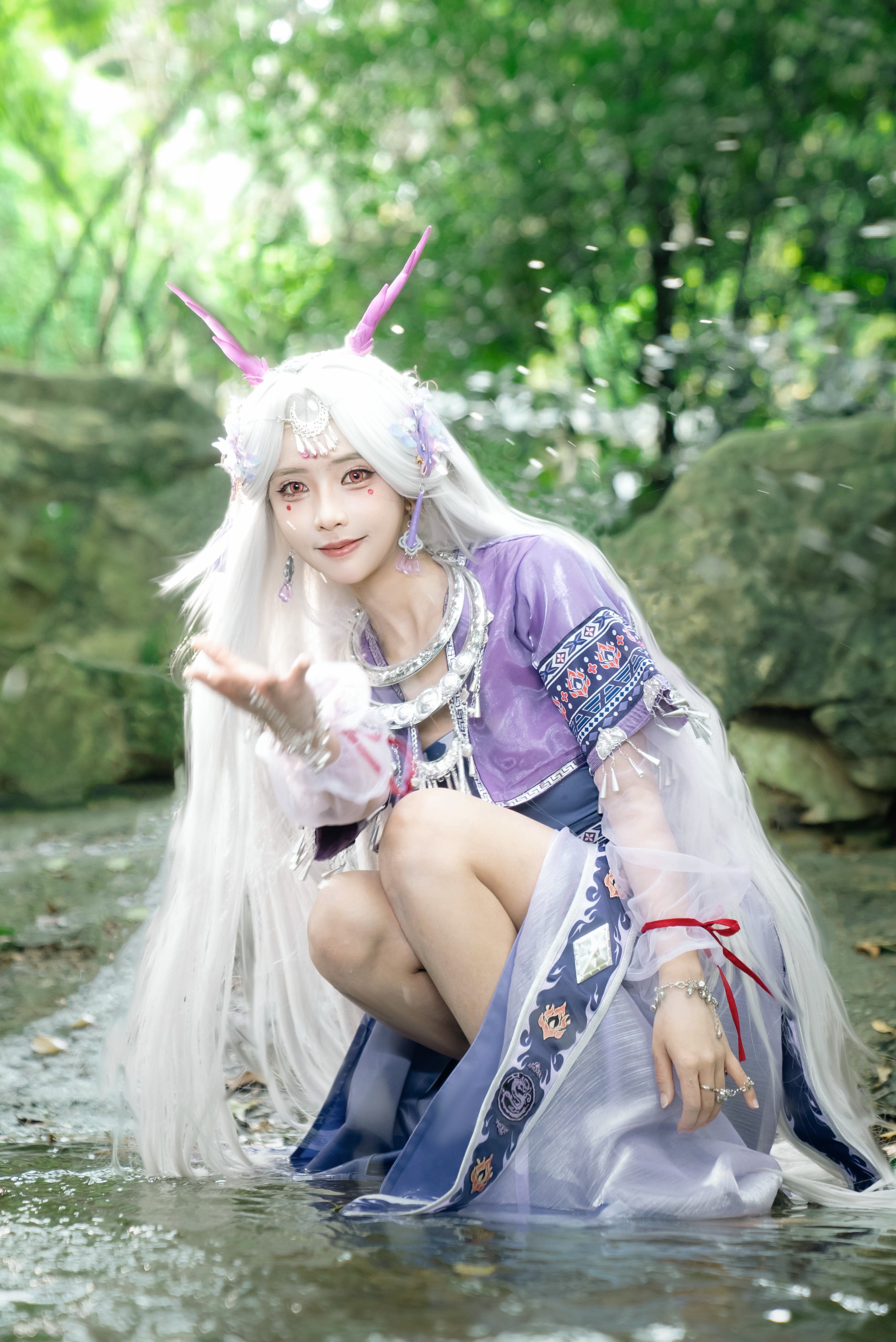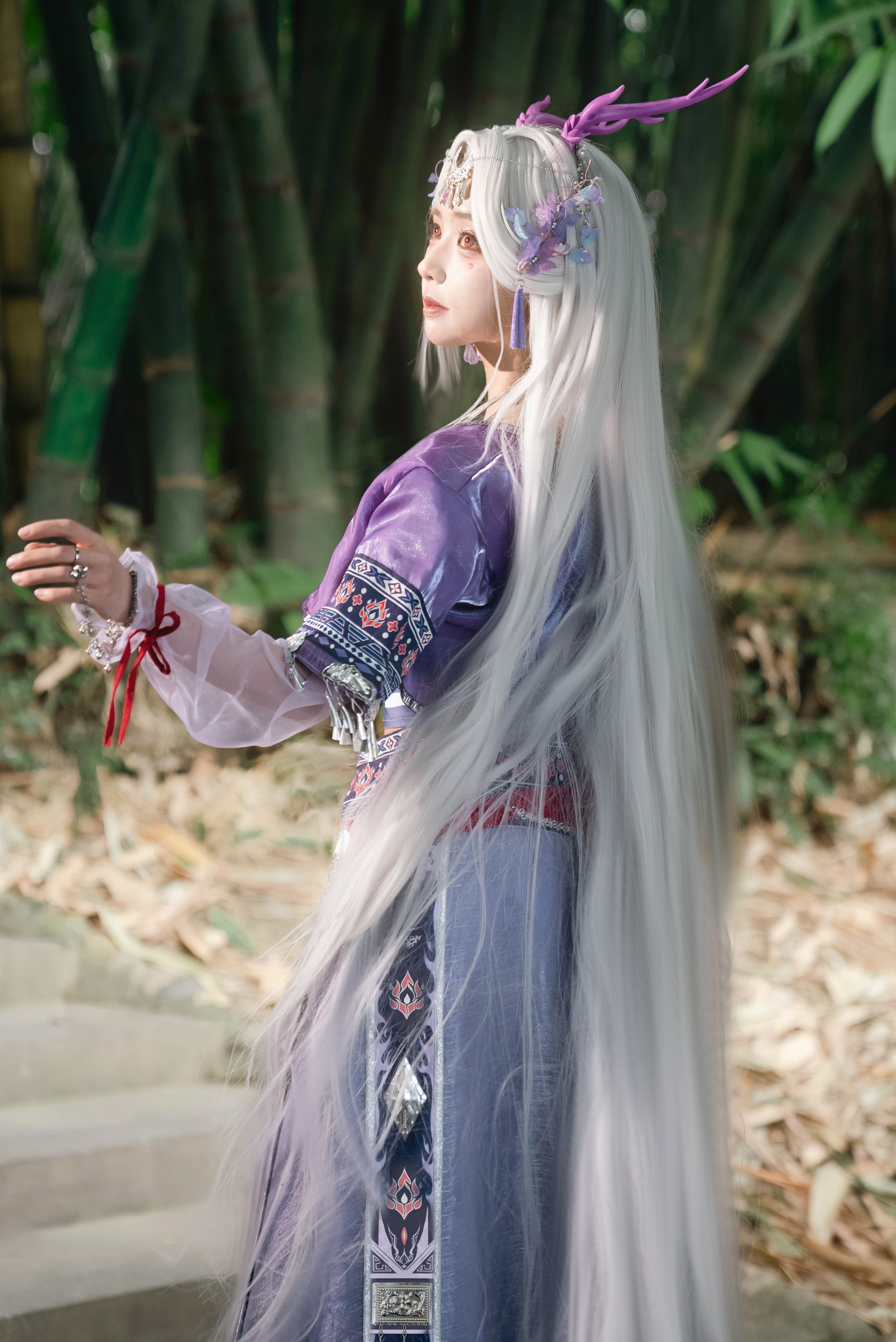 她着一袭绣有苗族纹样的紫裙;