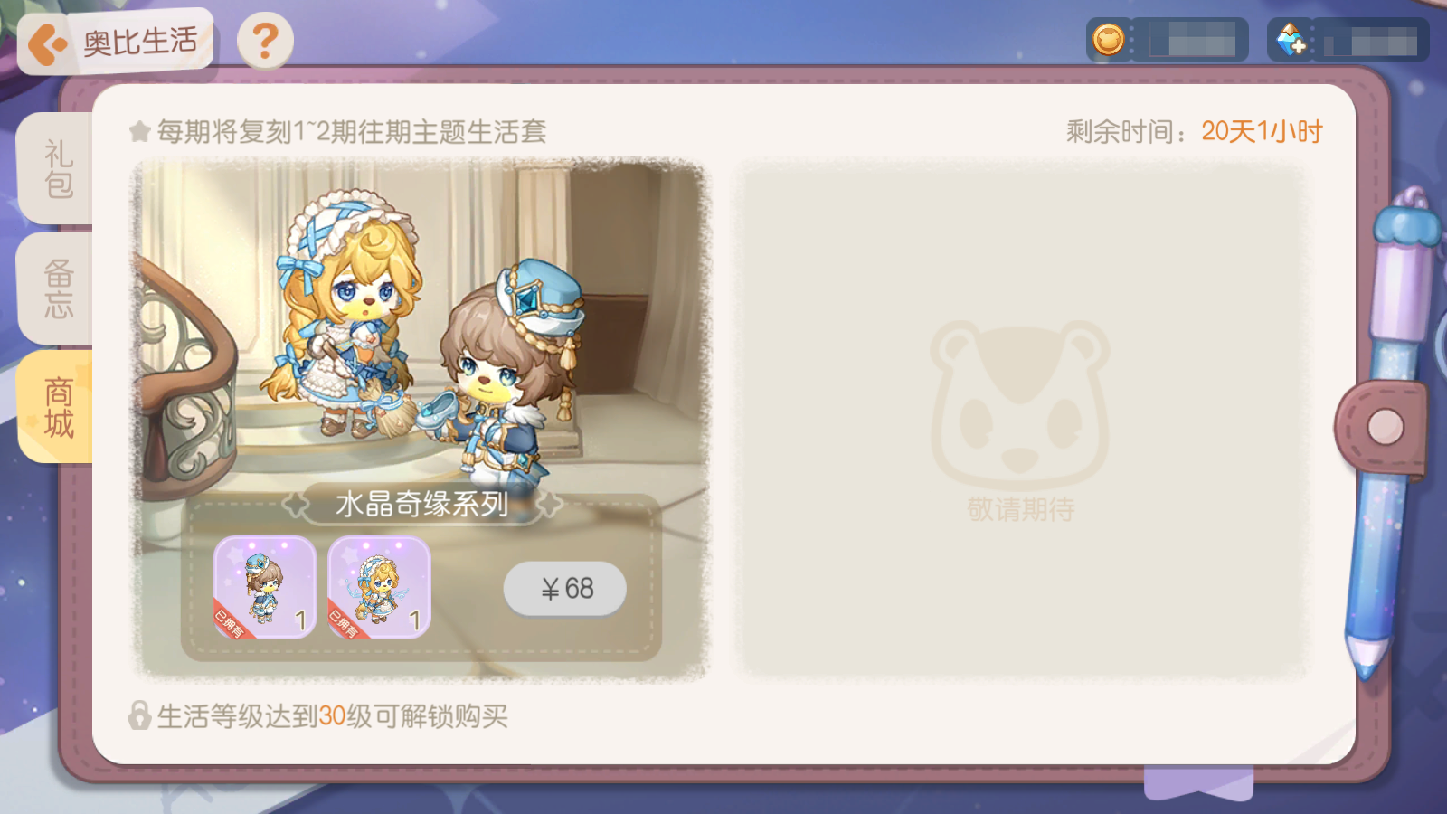 温馨提醒:购买本次两套返场装扮「水晶奇缘套装」「水晶挚爱套装」不等同于解锁本期星座生活系列的「精致生活」和「豪华生活」。