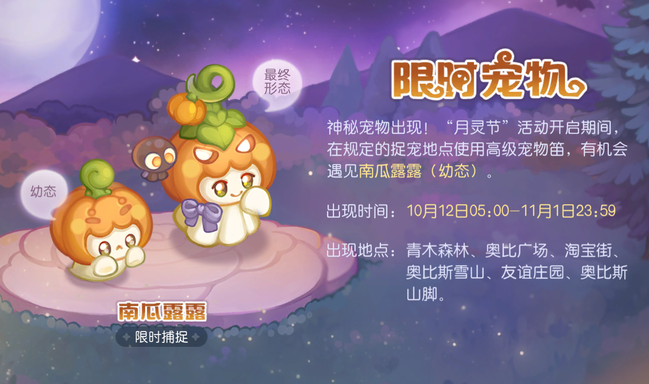 神秘宠物出现,活动期间限定宠物「南瓜露露」将会出现在奥比岛。前往岛内捉宠地点,使用高级宠物笛就有机会和它相遇哦。