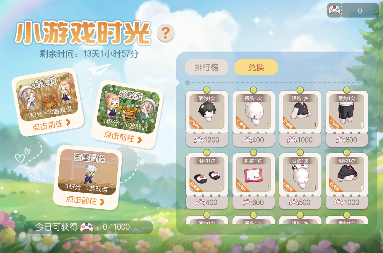 第六期小游戏时光上新!活动期间参与指定小游戏可获得游戏点数,消耗游戏点数可用于商店兑换喜欢的装扮和道具噢!
