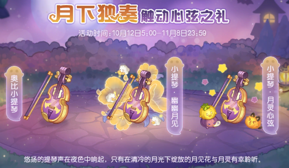 限时礼包「小提琴乐器礼包」、「月灵幻音铃礼包」和「幽幽幻音铃礼包」限时上架,购买可获得限定随身乐器「奥比小提琴」、乐谱「小提琴·月灵心弦」和「小提琴·幽幽月见」,喜欢的小奥比们快快行动吧!